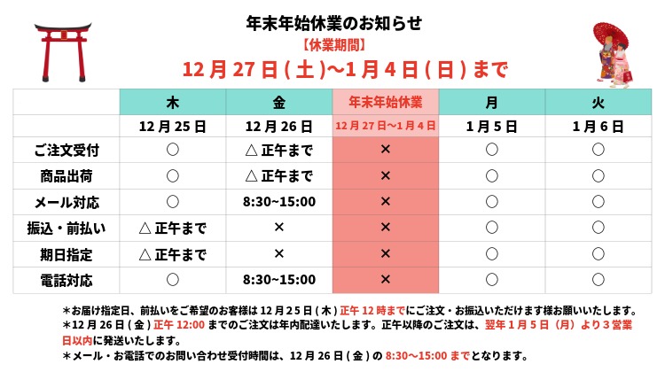 12月27日(土) ~1月4日(日) にご注文いただいた商品は、
